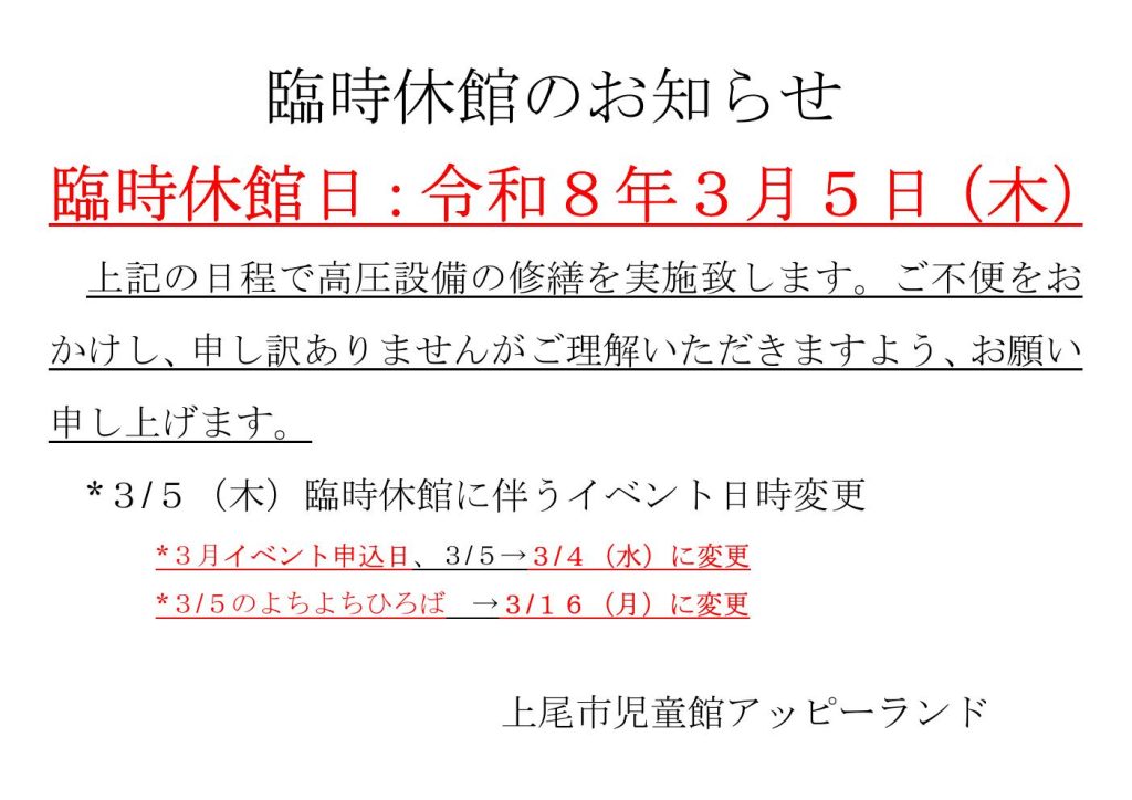 3月5日臨時休館のお知らせ